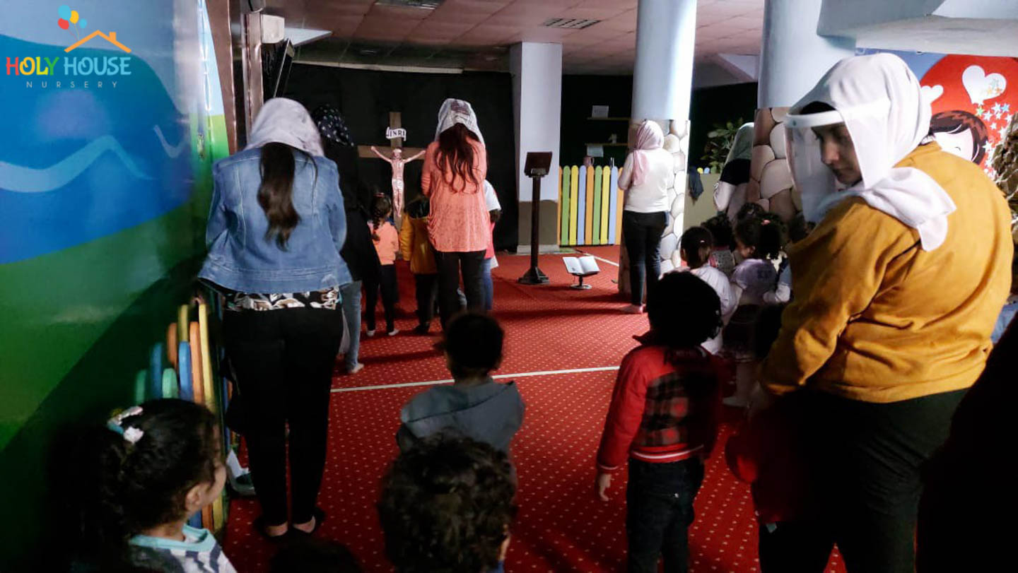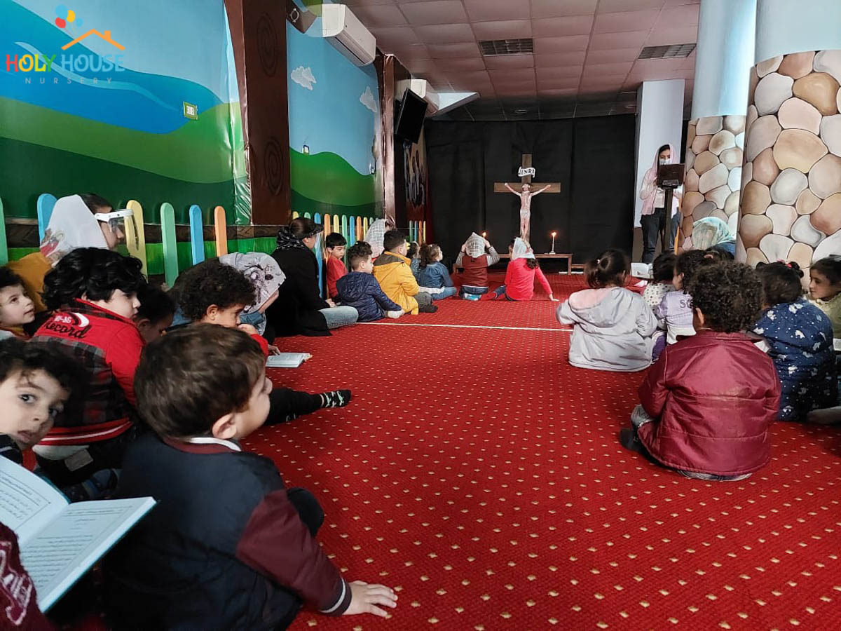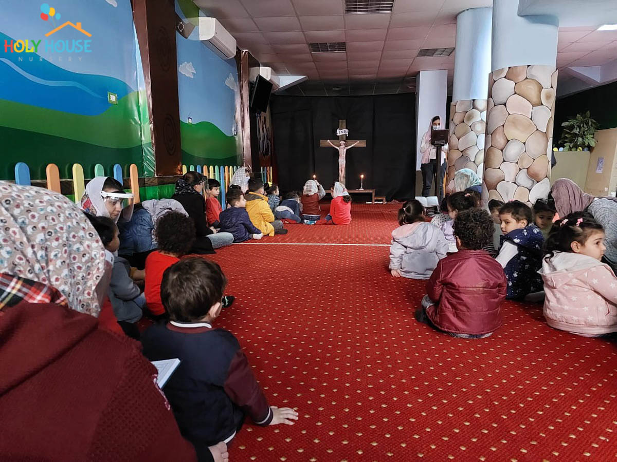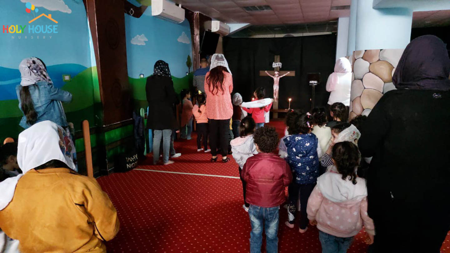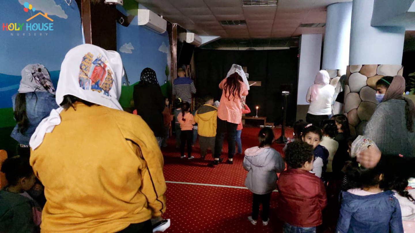 على أثار خطوات السيد المسيح له المجد ، يسير الأطفال في حضانة البيت المُقَدَّس ليتتبع يوماً بيوم أحداث أسبوع الآلم ، من خلال الإشتراك في صلوات البصخة المقدسة التي تقام بالكنيسة الخاصة بالأطفال داخل الحضانة ، حيث يستمع الأطفال لأحداث اليوم ، و يقومون بعمل الميطانيات و ترديد الألحان المميزة في هذا الأسبوع المميز