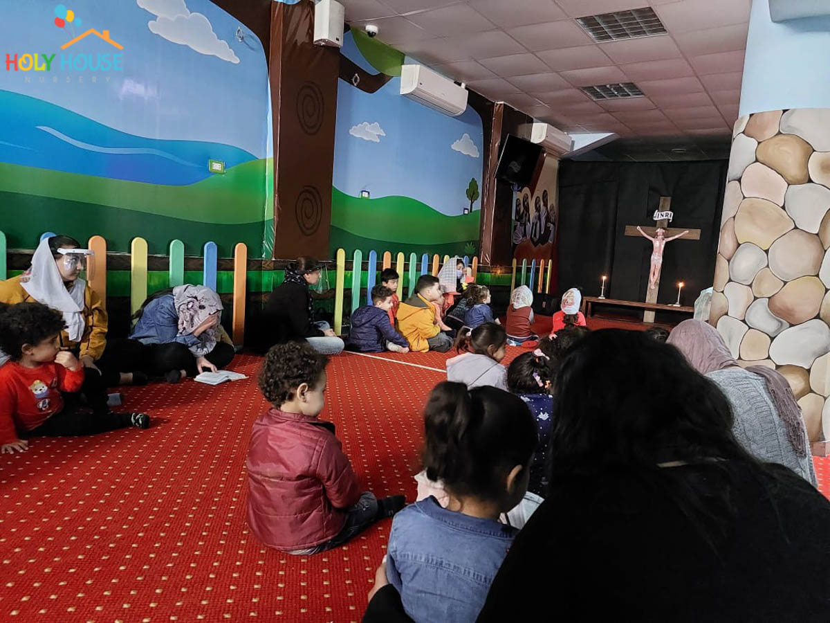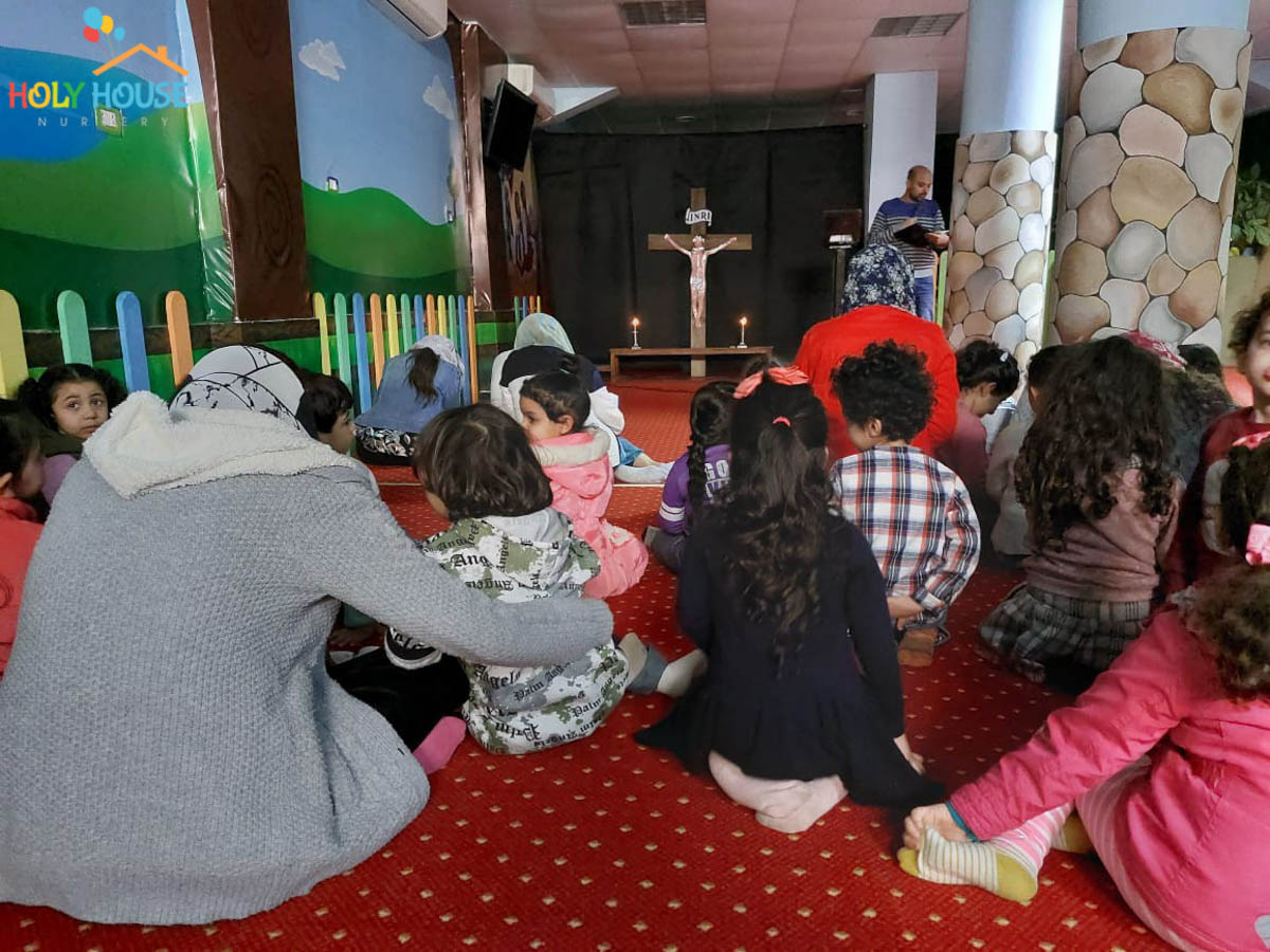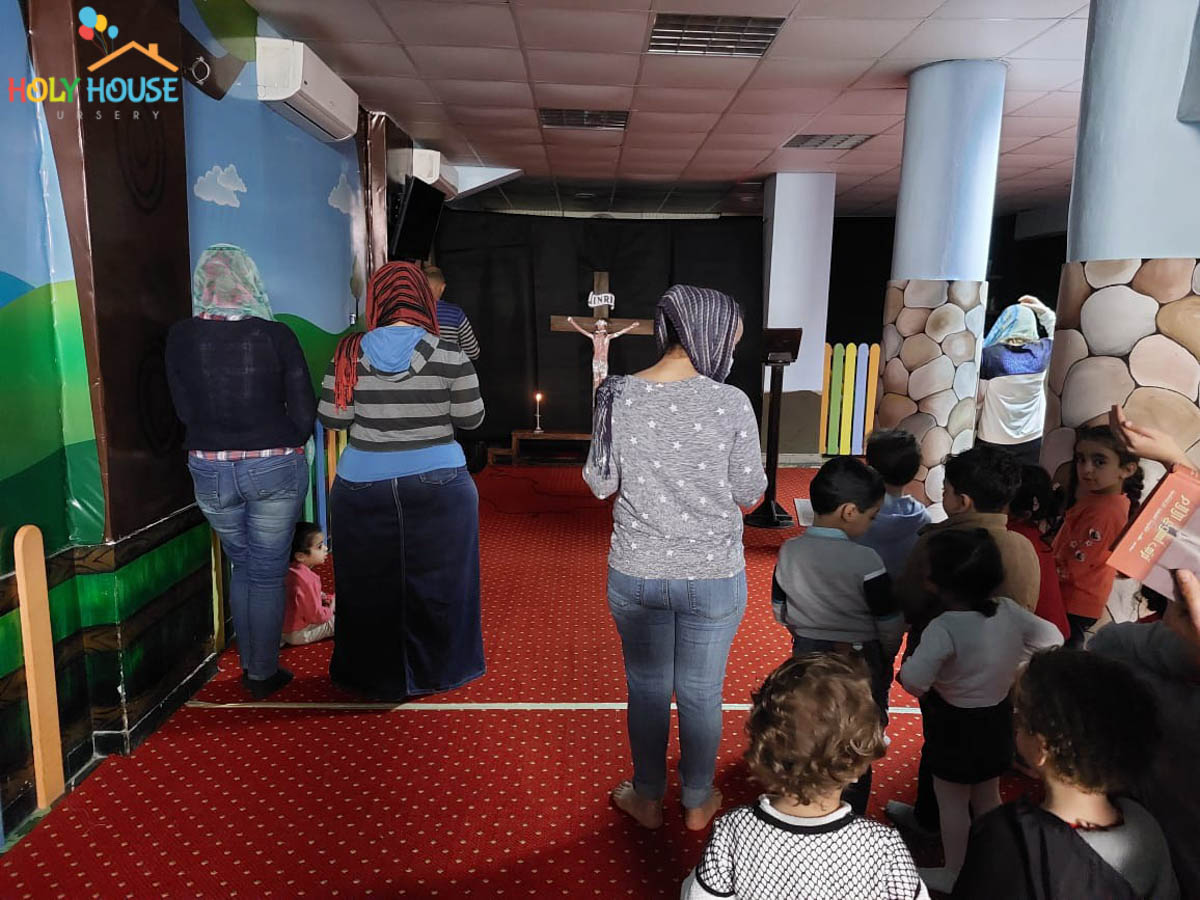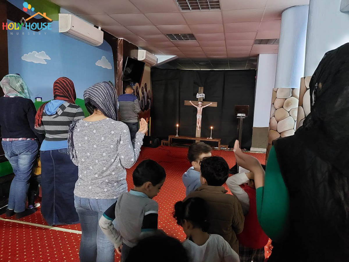 على أثار خطوات السيد المسيح له المجد ، يسير الأطفال في حضانة البيت المُقَدَّس ليتتبع يوماً بيوم أحداث أسبوع الآلم ، من خلال الإشتراك في صلوات البصخة المقدسة التي تقام بالكنيسة الخاصة بالأطفال داخل الحضانة ، حيث يستمع الأطفال لأحداث اليوم ، و يقومون بعمل الميطانيات و ترديد الألحان المميزة في هذا الأسبوع المميز