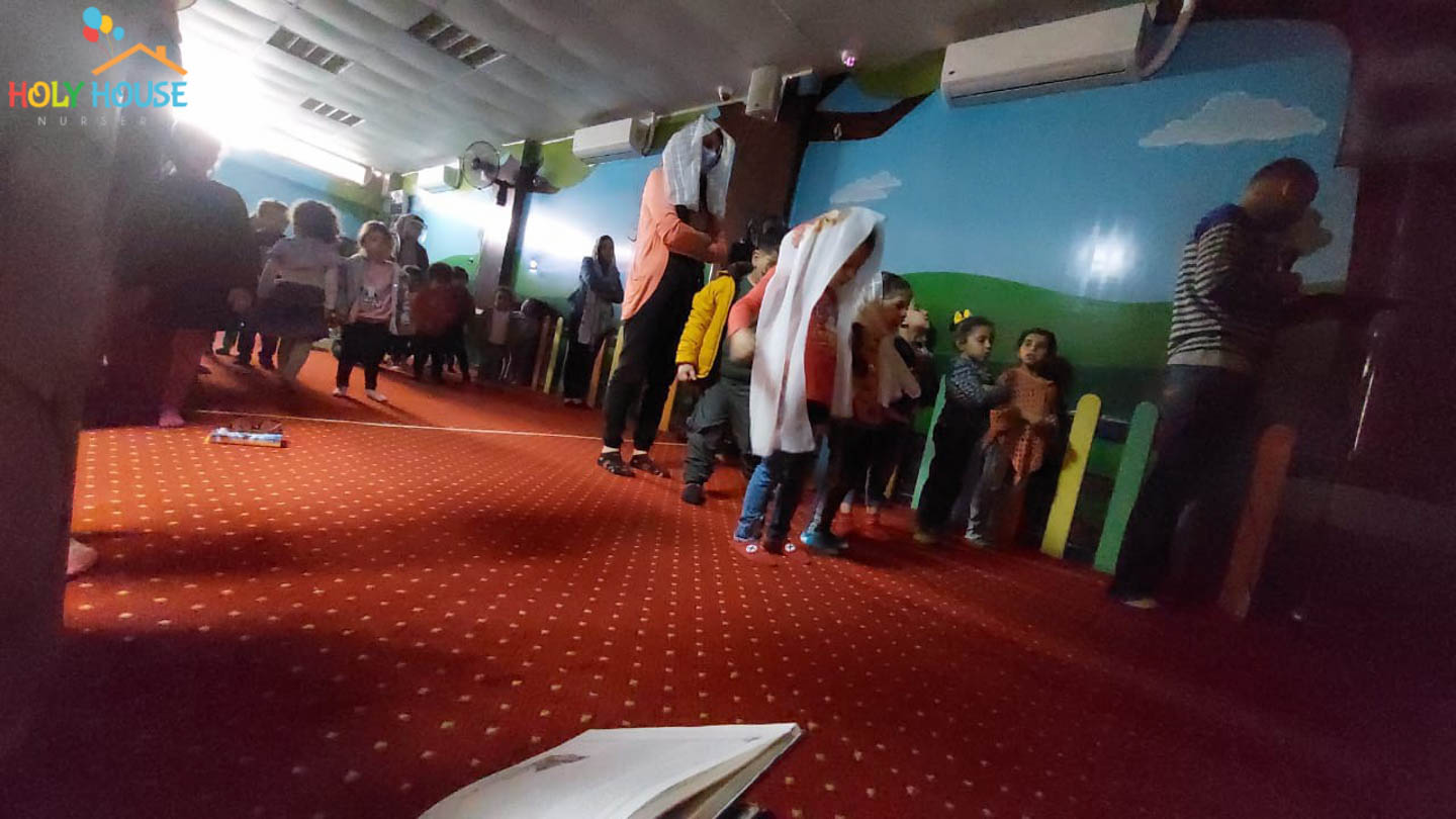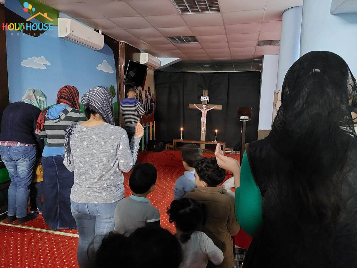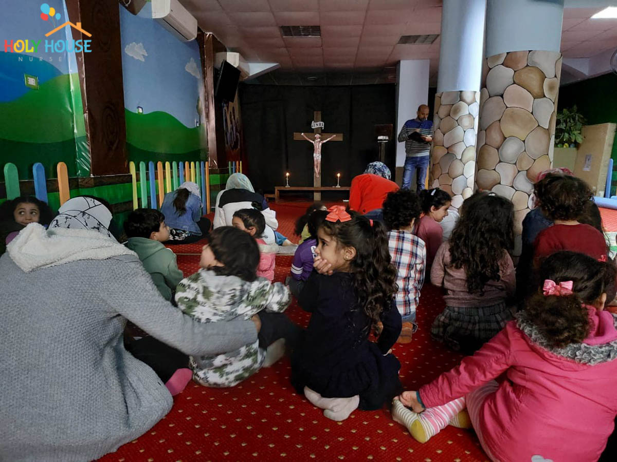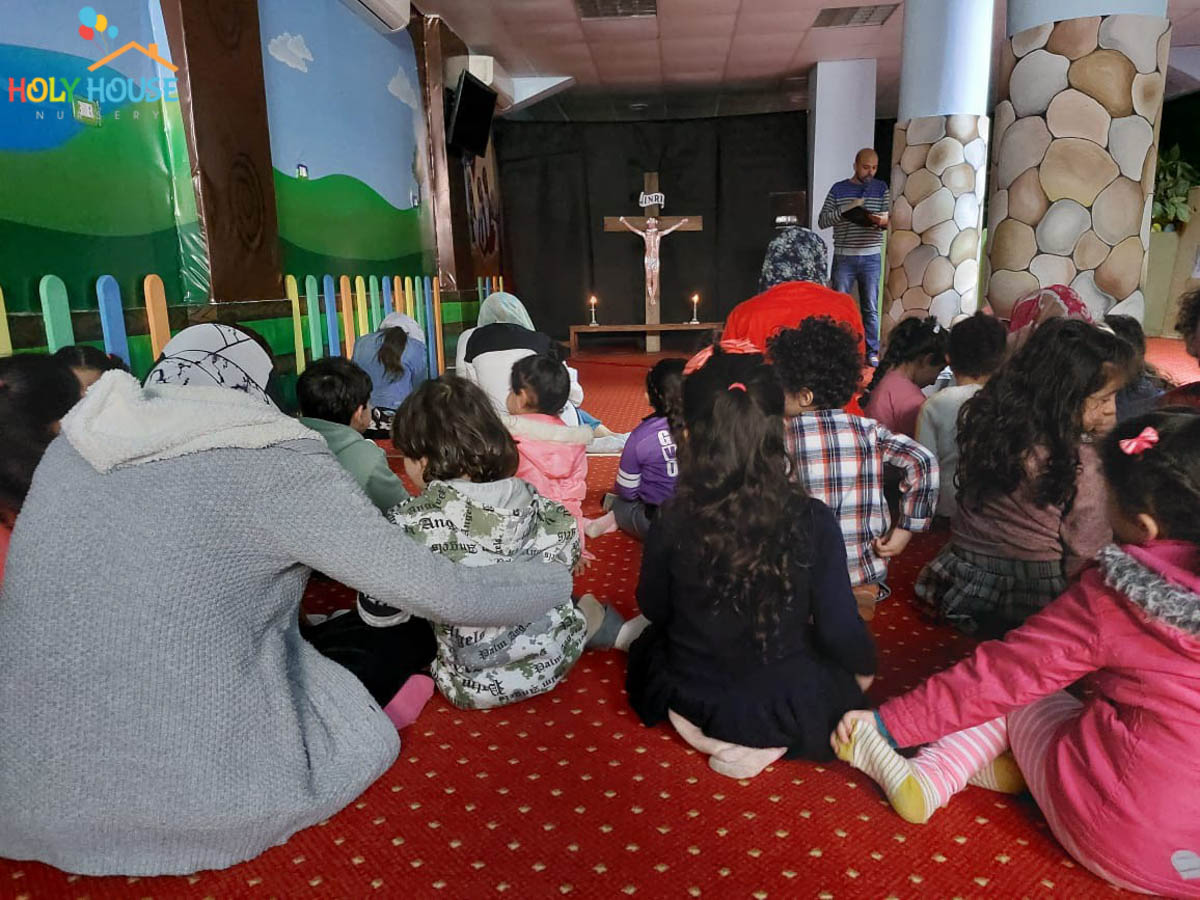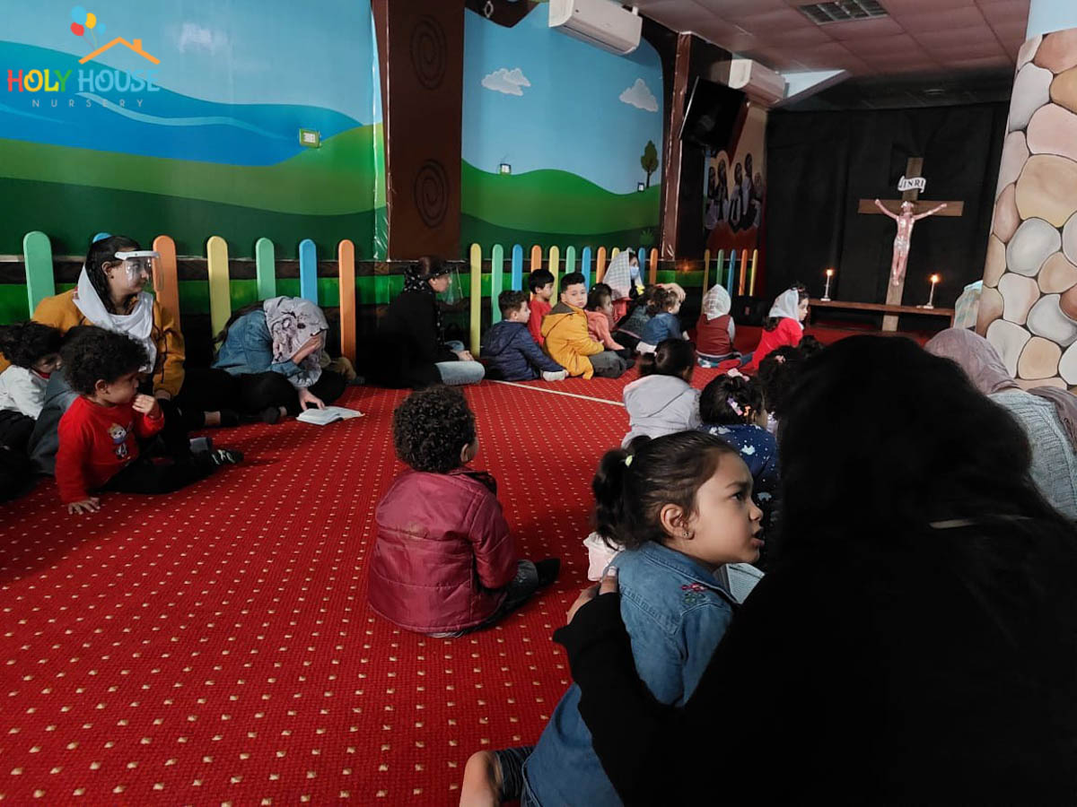 على أثار خطوات السيد المسيح له المجد ، يسير الأطفال في حضانة البيت المُقَدَّس ليتتبع يوماً بيوم أحداث أسبوع الآلم ، من خلال الإشتراك في صلوات البصخة المقدسة التي تقام بالكنيسة الخاصة بالأطفال داخل الحضانة ، حيث يستمع الأطفال لأحداث اليوم ، و يقومون بعمل الميطانيات و ترديد الألحان المميزة في هذا الأسبوع المميز